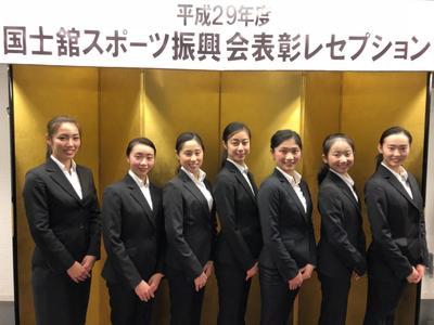 女子新体操部からは、全日本学生選手権大会、全日本新体操選手権大会個人総合優勝の立澤孝菜選手と、全日本新体操選手権大会種目別優勝の団体Aチーム(佐久間、栗原、徳田、伊藤、権藤、川久保)が表彰式に参加致しました。 世界選手権、ワールドカップでメダルを獲得した個人皆川夏穂選手と団体横田葵子選手(フェアリーJAPAN POLA)はロシアでの合宿中の為、欠席させて頂きました。 各部から、上位の中で健闘し、レベルの高いものを日々目指す選手が集っており、とても刺激を受けました。