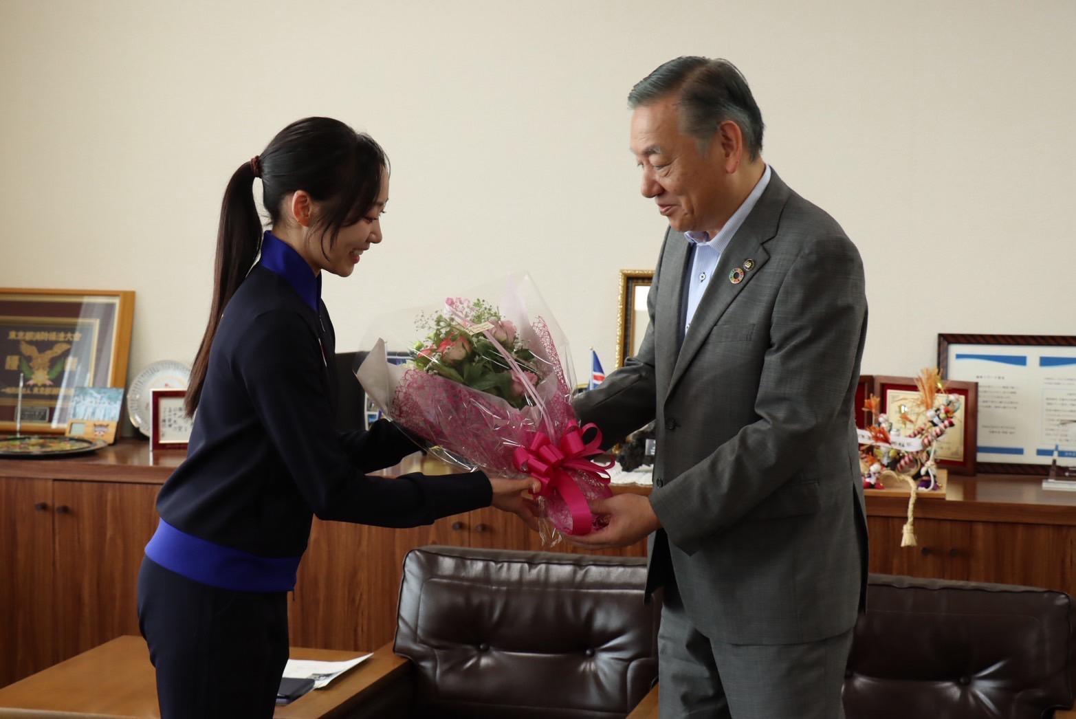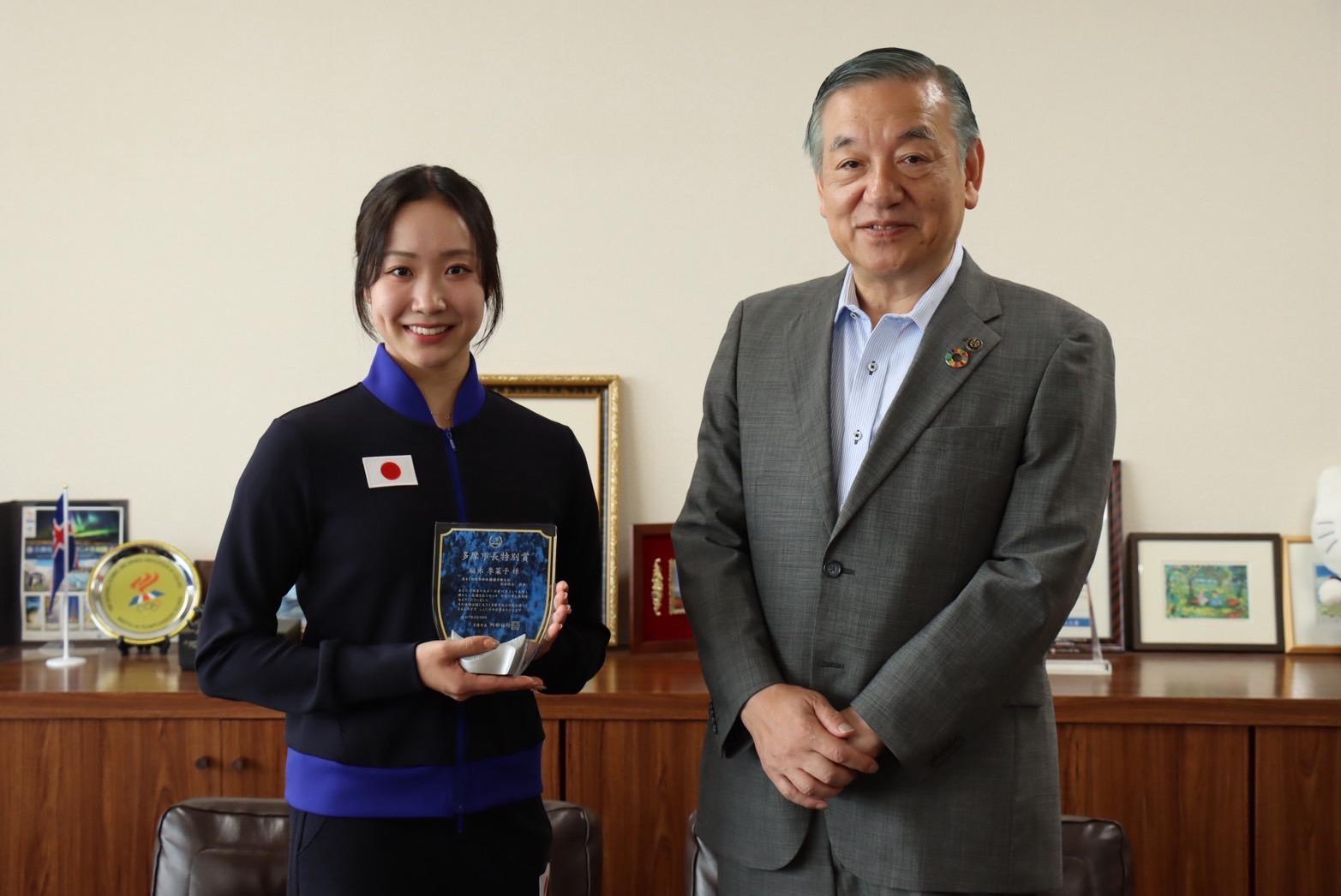 多摩市長へ表敬訪問にお伺いし、『多摩市長特別賞』をいただきました。 また、国士舘大学多摩キャンパスがある多摩市に結果のご報告をすることができ、大変光栄に思っております。 新体操に集中できる環境づくりなど、多くのご支援をいただいたおかげでこのような結果を残すことができました。 本当にありがとうございました。